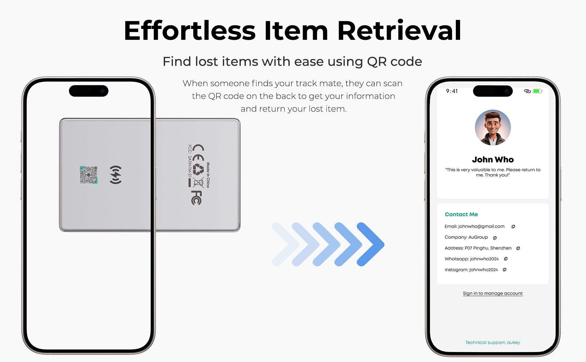 CES Innovation Awards 2025 HonoreeRecognized by CES Innovation Awards with outstanding design and functionality.Useful TrackerThis tracker helps you keep track of your personal belongings. Just attach it to items like your keys, toys, or wallets to find them effortlessly.QR CodeThe QR code on the back enables users to update contact information and manage a digital business card, making it ideal for both networking and the recovery of lost items.Ultra Thin DesignIt’s as thin as 2.2mm.Qi Wireless ChargingAdopts Qi wireless charging and prolongs the lifespan by reducing the damage from constantly plugging and unplugging.Work with Apple DevicesConnect the tracker on Find My on your iPhone, iPad, and Mac.Premium Tempered Glass EnclosureThe premium tempered glass enclosure offers strong protection from dropping and falling.IP67 Dust & Water ResistanceHighly resistant to dust and water, delivering excellent user experience with the IP67 ratings.Loud BeeperThe 80db beeping volume is loud enough for you to locate the item you are finding.Model:TM-21Battery Capacity:170mAhBuzzer:80dbCharging Time:2hOperating Temperature:0-65℃ / 32-149℉Dimensions:54 x 85.5 x 2.4mm / 2.13” x 3.37” x 0.09”Weight:20.4g / 0.72oz